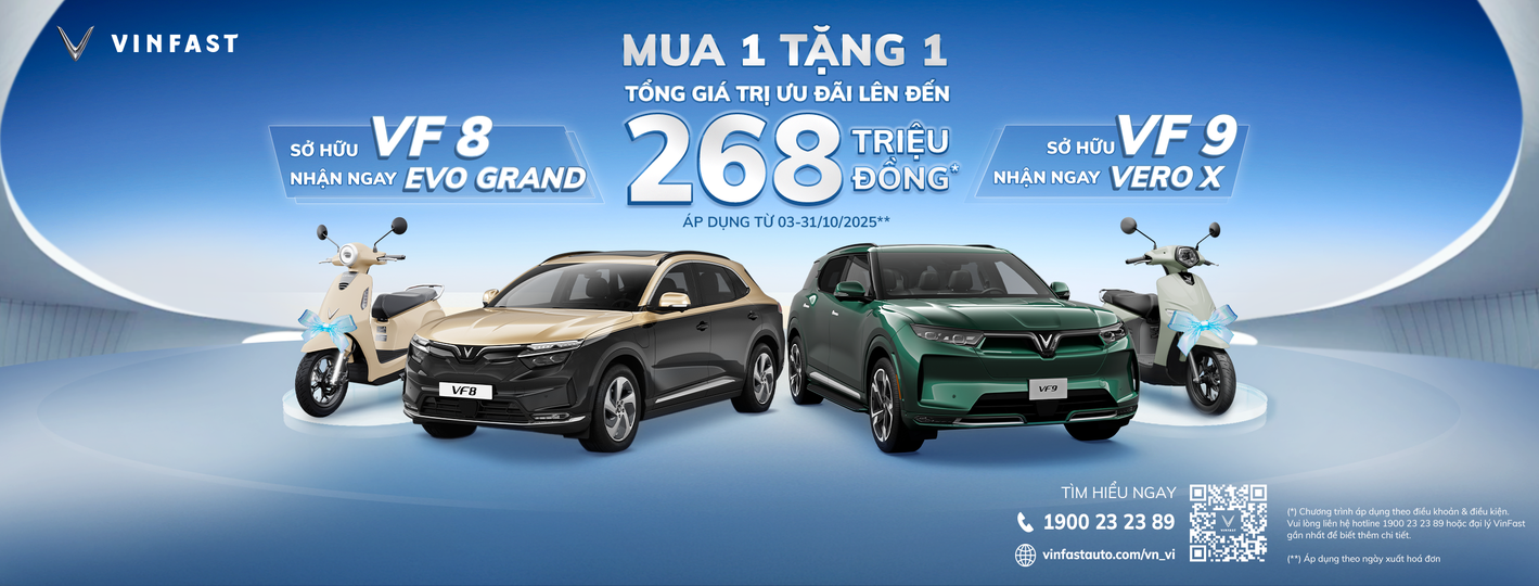 VinFast vừa công bố chương trình ưu đãi cực hấp dẫn trong tháng 10/2025 mang tên “Mua 1 tặng 1”, dành riêng cho khách hàng mua xe VF8 và VF9. Theo đó, khách hàng khi sở hữu hai mẫu SUV điện cao cấp này sẽ được tặng ngay xe máy điện VinFast với tổng giá trị ưu đãi lên đến 268 triệu đồng.